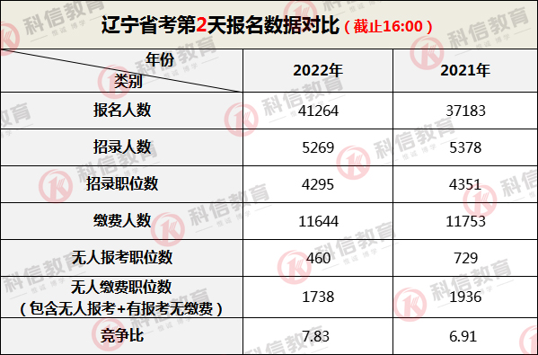 2022年辽宁公务员考试公告于2月14日正式发布,报名时间为2月18日—2月22日,今天是2022年辽宁公务员考试报名的第二天,截至19日16时,科信教育公布了辽宁省公务员考试第二日报名数据,报名人数达到41264人,虽然今年招聘总人数比去年有所下降,但考生报名热度丝毫没有减少。