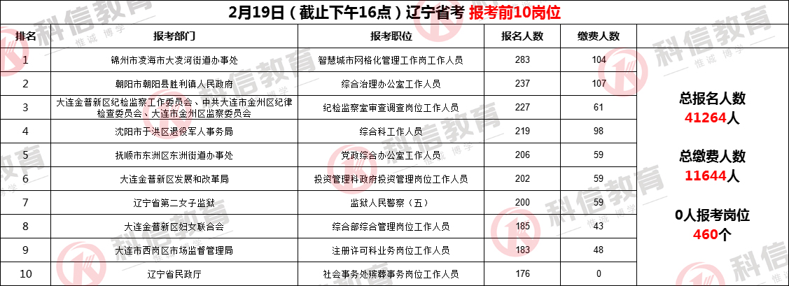 根据科信教育提供的数据显示,截至2月19日16时,无人报考岗位有460个,对比首日报名数据来看,昨日16时还有1116个岗位无人报考,今天就已经锐减至460个。