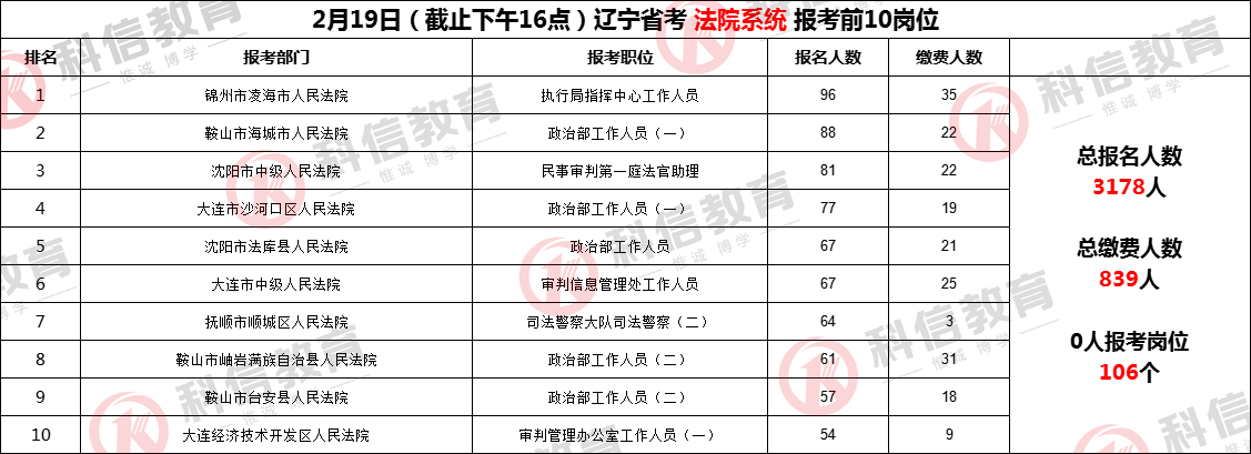 根据科信教育统计发现,截至2月19日16时,法院系统总报名人数达到3178人,总缴费人数839人,无人报考岗位共计106个,同比昨日减少了77个。