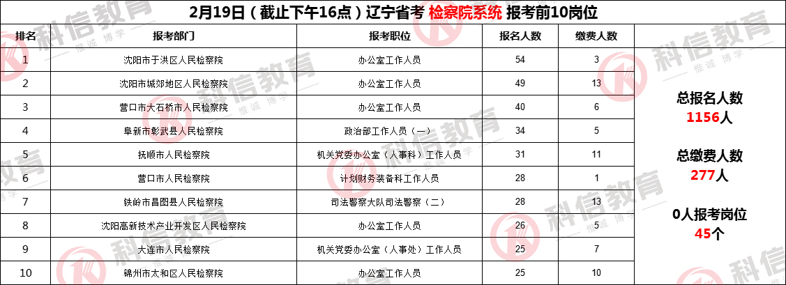 截至2月19日16时,科信教育整理了检察院系统报名人数前十的岗位,总缴费人数277人,总报名人数达到1156人,0人报考岗位共计45个,同比昨日无人报考岗位减少了33个。