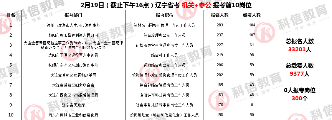 截至16时,据科信教育统计,机关+参公总报名人数为33201人,总缴费人数为9377人,无人报考岗位为300个。