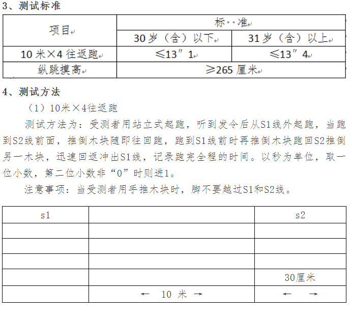 (2)体能测试项目中,纵跳摸高的测试的次数不超过3次,10米×4往返跑为1次。