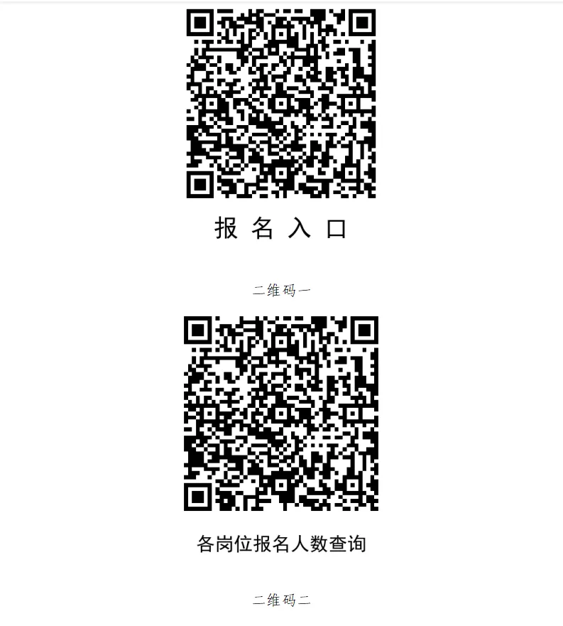 报名期间,考生可以通过扫描二维码(码二)的方式,查询本次社工招录考试各岗位报名人数情况(报名人数情况每日10:00和15:00更新一次)。