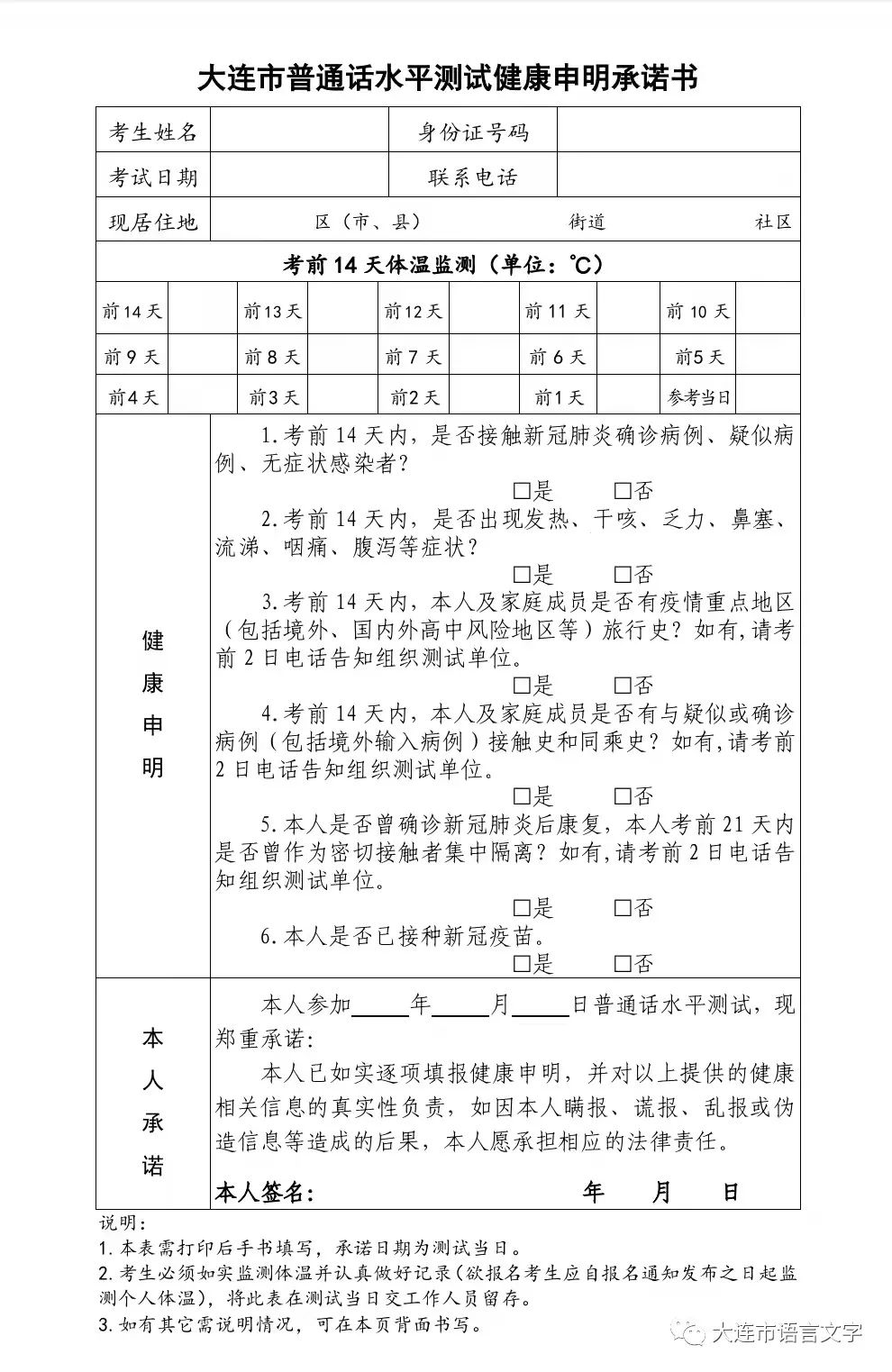 2.考生参加测试时必须满足如下疫情防控要求。一是按照大连市有关防疫工作要求,本期测试所有参加测试考生均需持考前48小时内核酸检测阴性结果参加测试,外地来(返)连参加测试考生必须在大连本地医疗机构进行核酸检测,未核酸检测考生不得参加测试。二是提供纸质版“普通话水平测试承诺书”,需提前下载“附件一”,并按照要求填写相关内容,承诺书测试当日交工作人员,无承诺书不得参加测试。三是测试当日需提供本人实时国务院防疫行程卡绿码和辽事通健康码绿码。考生考前尽量不出市、不接触进口冷链食品、不参加人员聚集等相关活动,出行做好个人防护。所有欲报名参加测试考生,自3月5日开始监测个人健康状况。因隐瞒个人情况造成疫情防控风险的考生,由防疫及公安部门处理。