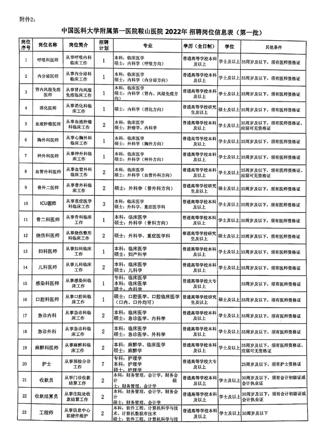 附件:《中国医科大学附属第一医院鞍山医院2022年公开招聘工作人员岗位信息表》