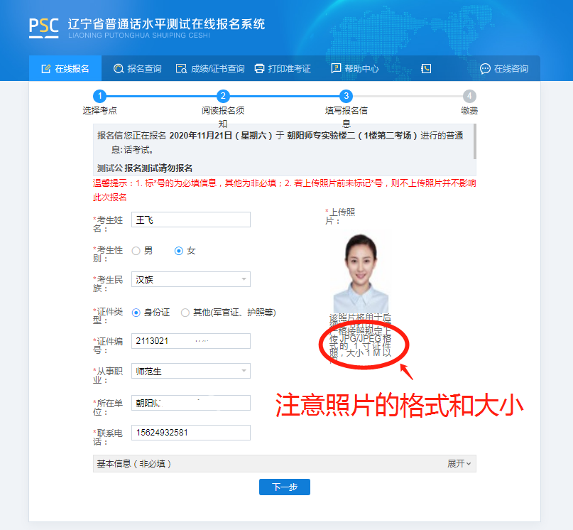 (3)填写完整的个人信息后,上传个人电子版照片,个人电子版照片要求:近期免冠彩色照片,白底,像素不低于390*567,大小不超过200kb。认真审核所填信息,无误后点击“下一步”按钮(点击此按钮后信息无法进行修改),如信息有误、照片不符合要求则报名无效;