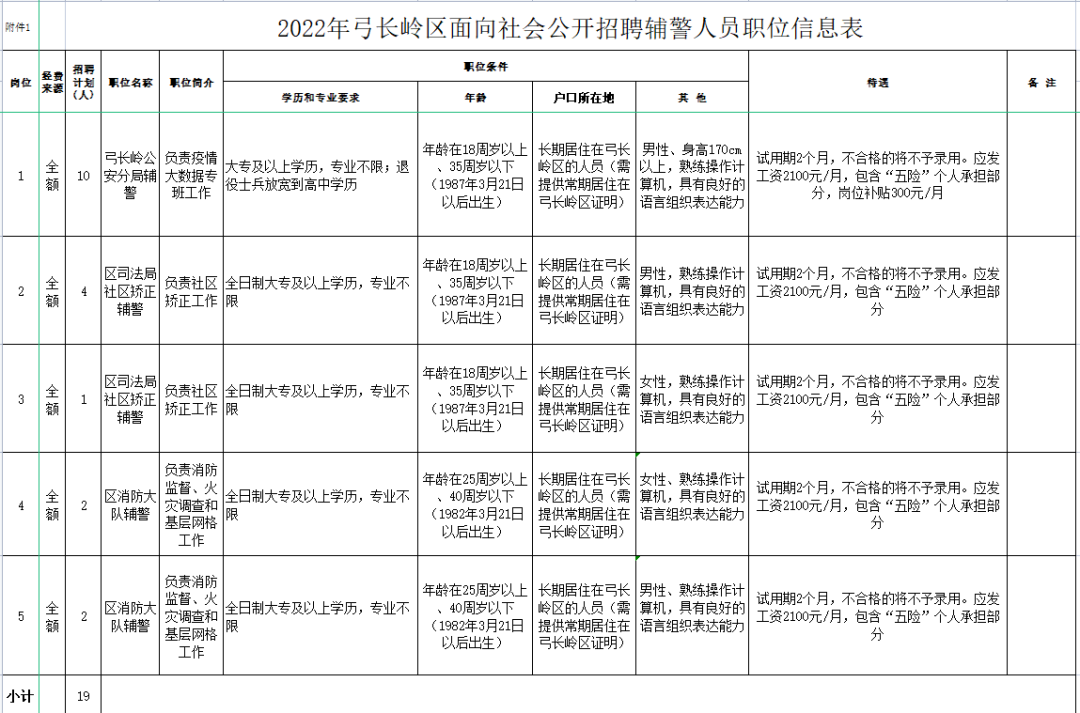 附件1: 2022年弓长岭区面向社会公开招聘劳动合同制辅警人员职位信息表