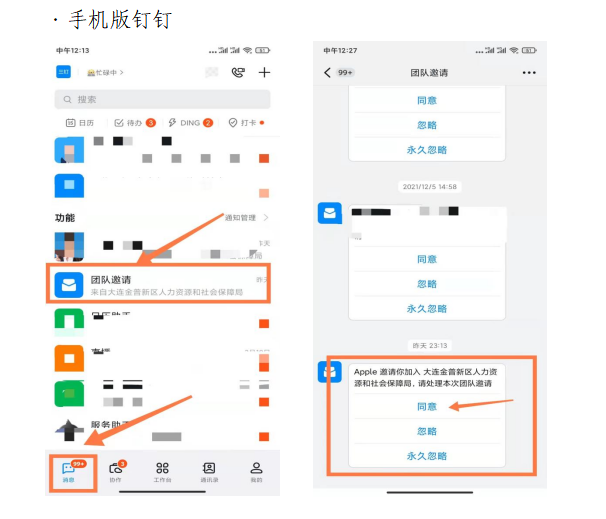 四、面试事项(一)面试平台 面试使用钉钉(Ding Talk)平台。系统会将考生分配到对应考试组别,考生应及时下载软件(电脑版钉钉请在官网dingtalk.com下载,安卓手机版钉钉请在各大应用商城下载,苹果手机版钉钉请在App Store下载)并于4月25日15:00前完成实名注册(注册请用真实姓名及报名登记表使用的本人联系电话)。钉钉新用户下载并注册钉钉后,会自动加入到【大连金普新区人力资源与社会保障局】组织架构,钉钉老用户,需要手动点“同意”,具体操作如下: