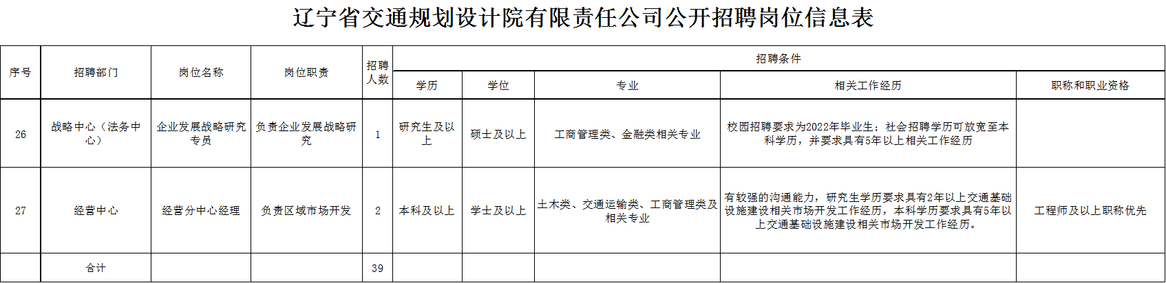 为满足业务发展需要,辽宁省交通规划设计院有限责任公司及下属公司拟面向社会招聘39名工作人员(具体岗位见《辽宁省交通规划设计院有限责任公司公开招聘岗位信息表》),现公告如下: