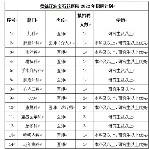 1、录用人员按盘锦辽油宝石花医院现行各项制度享受劳动报酬、五险二金、带薪年假、健康疗养、定期体检、带薪进修等福利待遇。