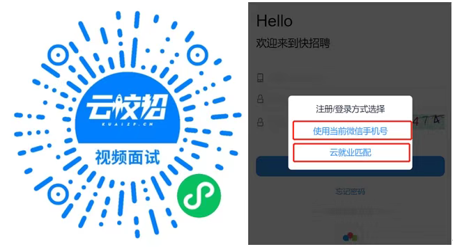 第一步:扫码进入云校招小程序页面(或微信搜索“云校招”小程序),并进行注册(如果为云就业合作高校,可以点击“云就业匹配”进行信息匹配后自动登录,如果为非云就业合作高校,或者匹配失败,则可以点击“使用当前微信手机号”进行注册)。