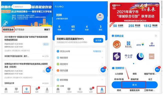 第二步:登录完成后,点击页面底部“简历”按钮,完善简历(简历完整度大于70%才可以报名招聘会),完成简历后,点击页面底部“双选会”按钮,选择对应的视频双选会,然后“报名/进入会场”进入企业列表页面。