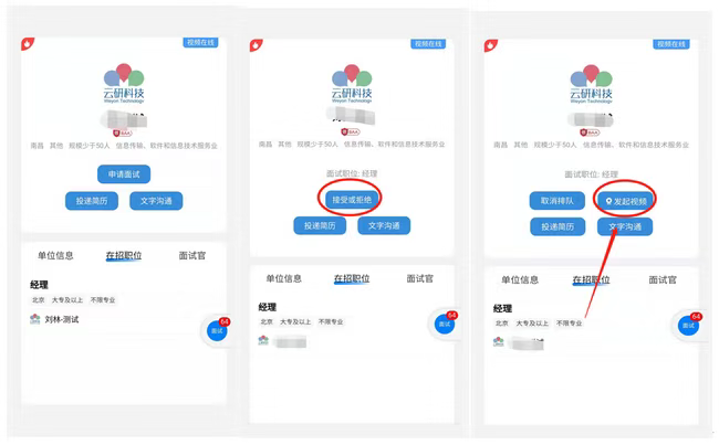第三步:进入企业列表后,招聘会召开前,可以点击单位名称查看单位详细信息,并进行简历投递以及可以跟单位进行文字沟通;招聘会召开当天,可以点击单位名称边上的视频按钮以及在职位详情页面,向单位发起面试申请。