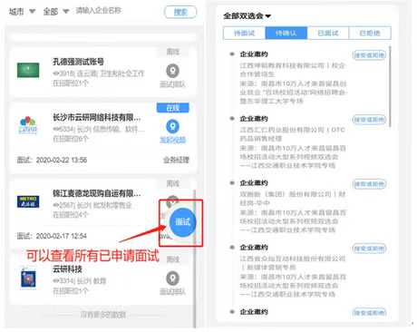 第四步:点击右侧“面试”按钮,进入面试页面,可以查看已申请面试是否通过,以及处理企业的面试邀约。