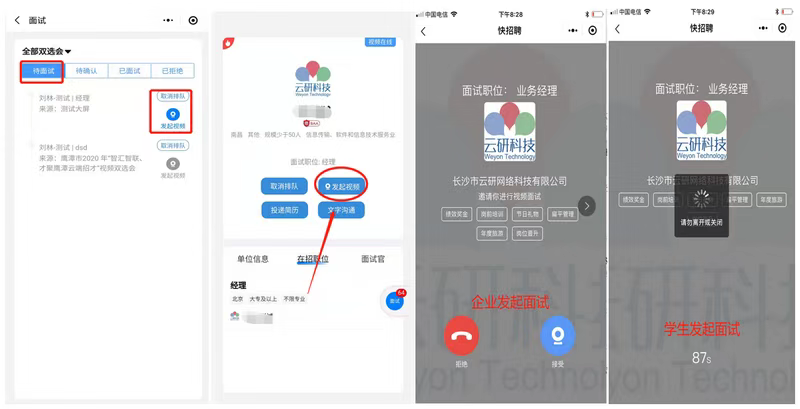第五步:出现“待面试”列表内容,表明企业已经同意进行面试,可以进入企业,自主发起视频面试(企业在线的状态下),也可以等企业发起面试(学生必须在小程序页面才能接受到邀请),面试完成后等待接收企业后期通知即可。