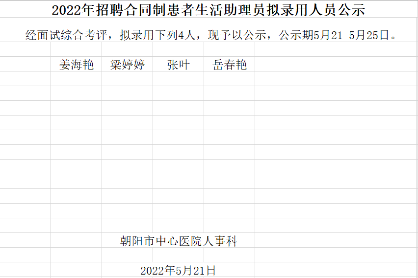 2022年朝阳市中心医院招聘合同制患者生活助理员拟录用人员公示