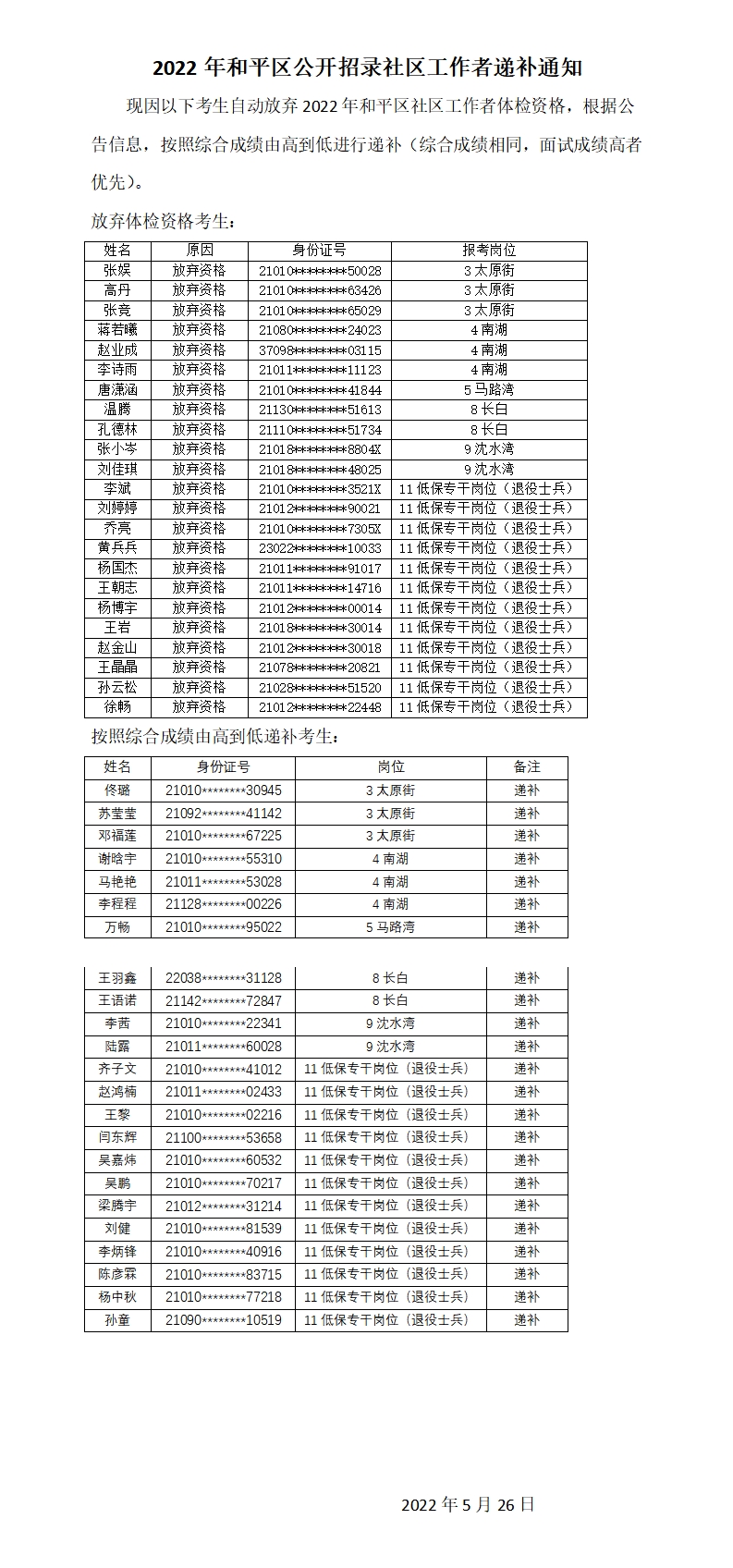 2022年沈阳市和平区公开招录社区工作者递补通知