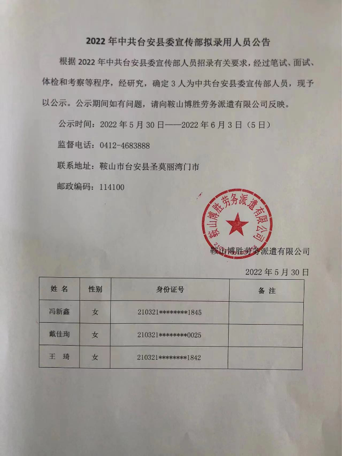 2022年鞍山市台安县中共台安县委宣传部拟录用人员公告