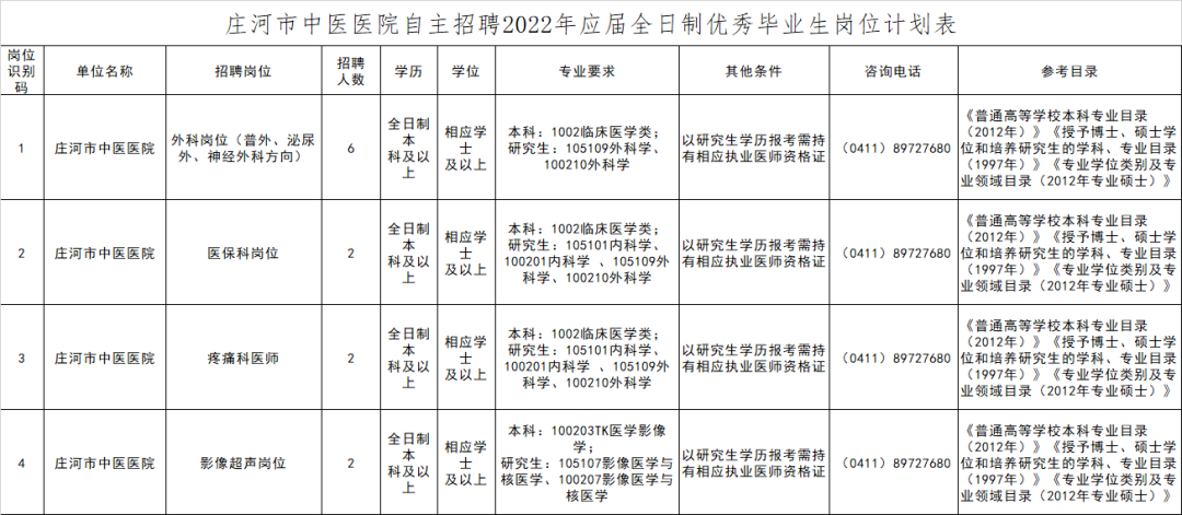 附件1:庄河市2022年医疗卫生机构自主招聘全日制优秀毕业生岗位计划表;