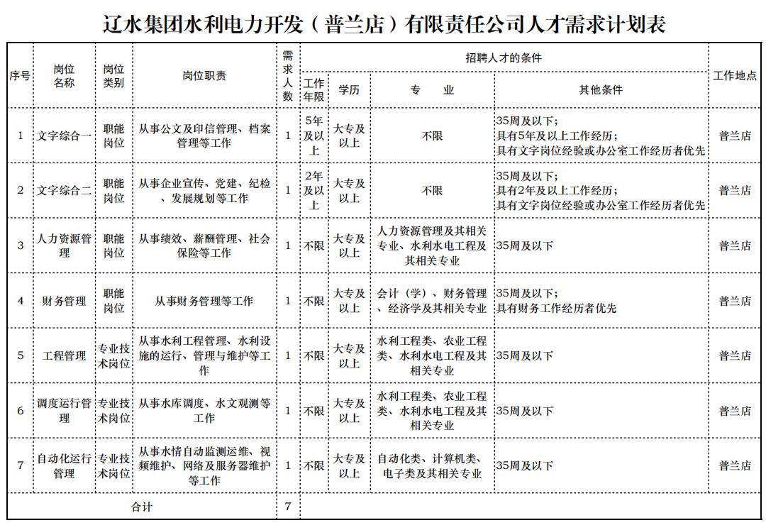 2.辽水集团水利电力开发(普兰店)有限责任公司人才需求计划表
