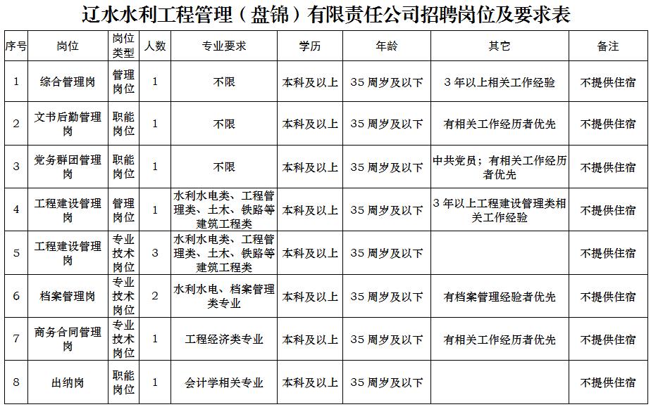 3.辽水水利工程管理(盘锦)有限责任公司招聘岗位及要求表
