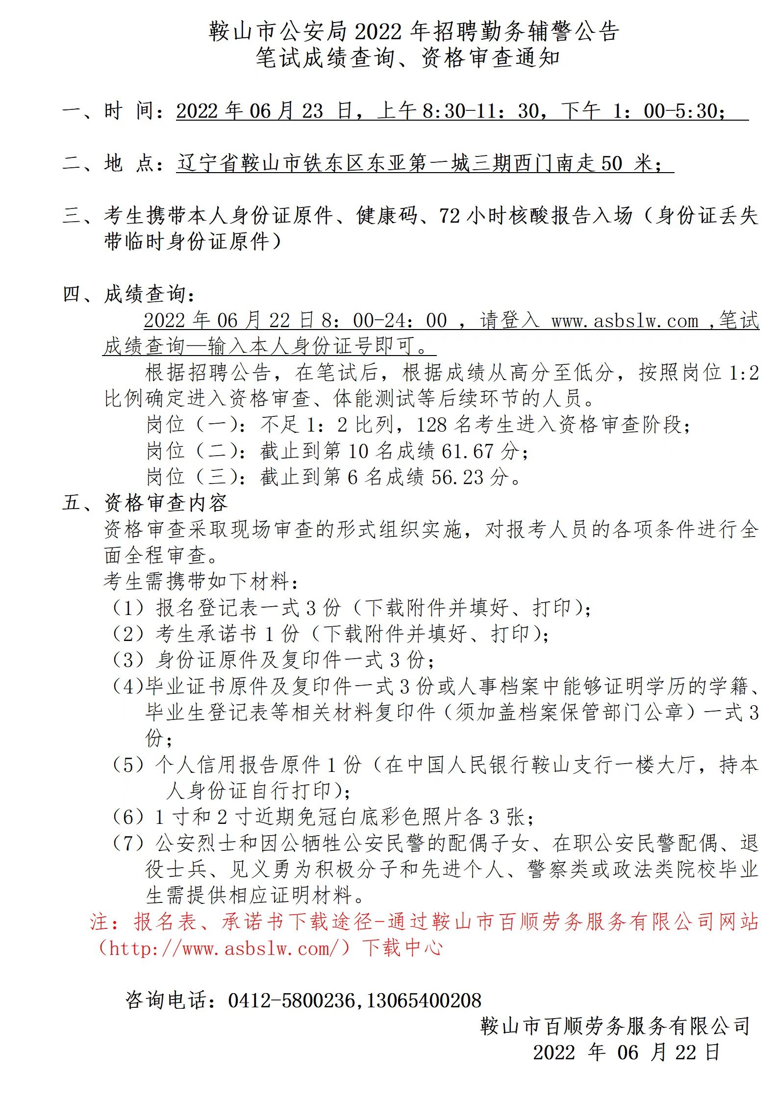 鞍山市公安局 2022 年招聘勤务辅警公告 笔试成绩查询、资格审查通知