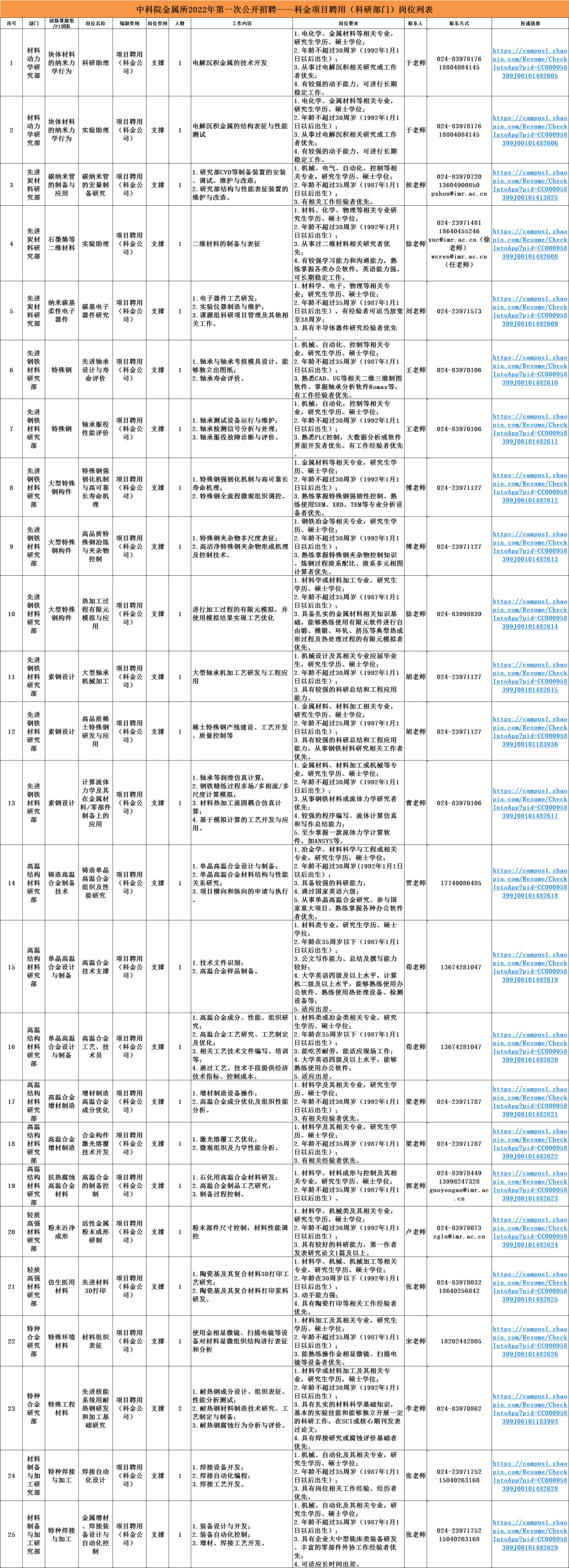根据《中国科学院金属研究所公开招聘管理办法》(科金人字〔2022〕16号)以及《中国科学院金属研究所人员聘用管理实施细则》(科金人字〔2016〕2号)相关要求,结合我所实际情况,现面向社会公开招聘科金项目聘用岗位人员,本次招聘相关事宜通知如下: