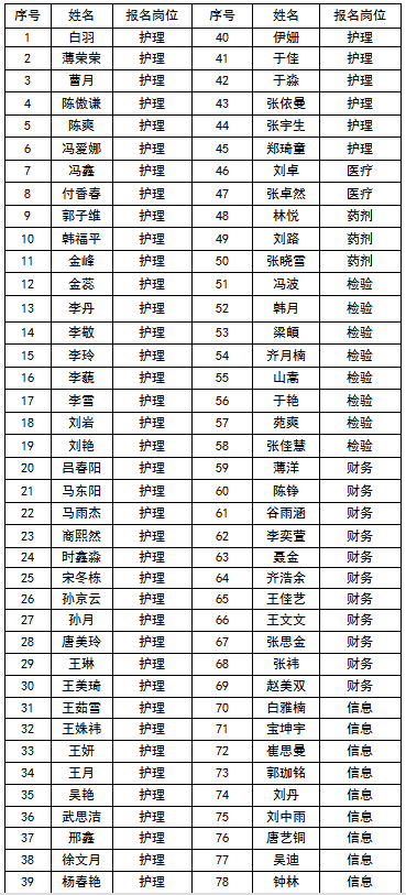 根据《阜新市第四人民医院公开招聘专业技术人员公告》的相关规定,现将各岗位报名审核通过人员名单公告如下:
