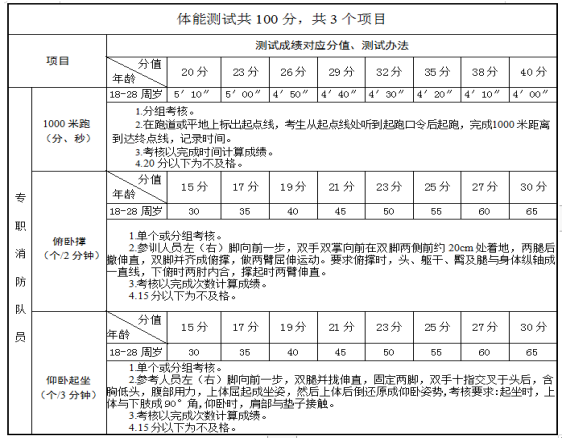 (1)消防队员体能测试+面试;体能测试项目如下,不合格不能进入面试;