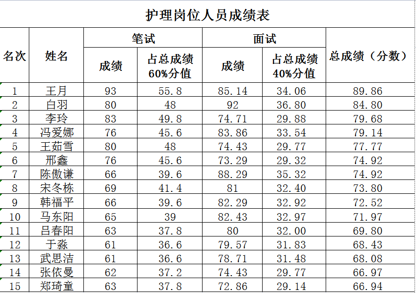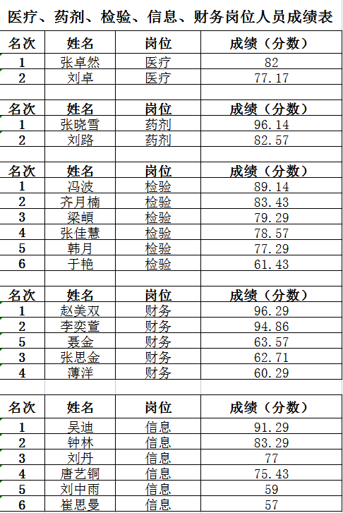 根据《阜新市第四人民医院2022年公开招聘专业技术人员公告》的相关规定,医疗岗位排名前两名,药剂岗位排名前一名、检验岗位排名前两名、财务科岗位排名前两名、信息岗位排名前一名、护理岗位排名前八名,拟录用为阜新市第四人民医院工作人员。现将成绩单予以公示: