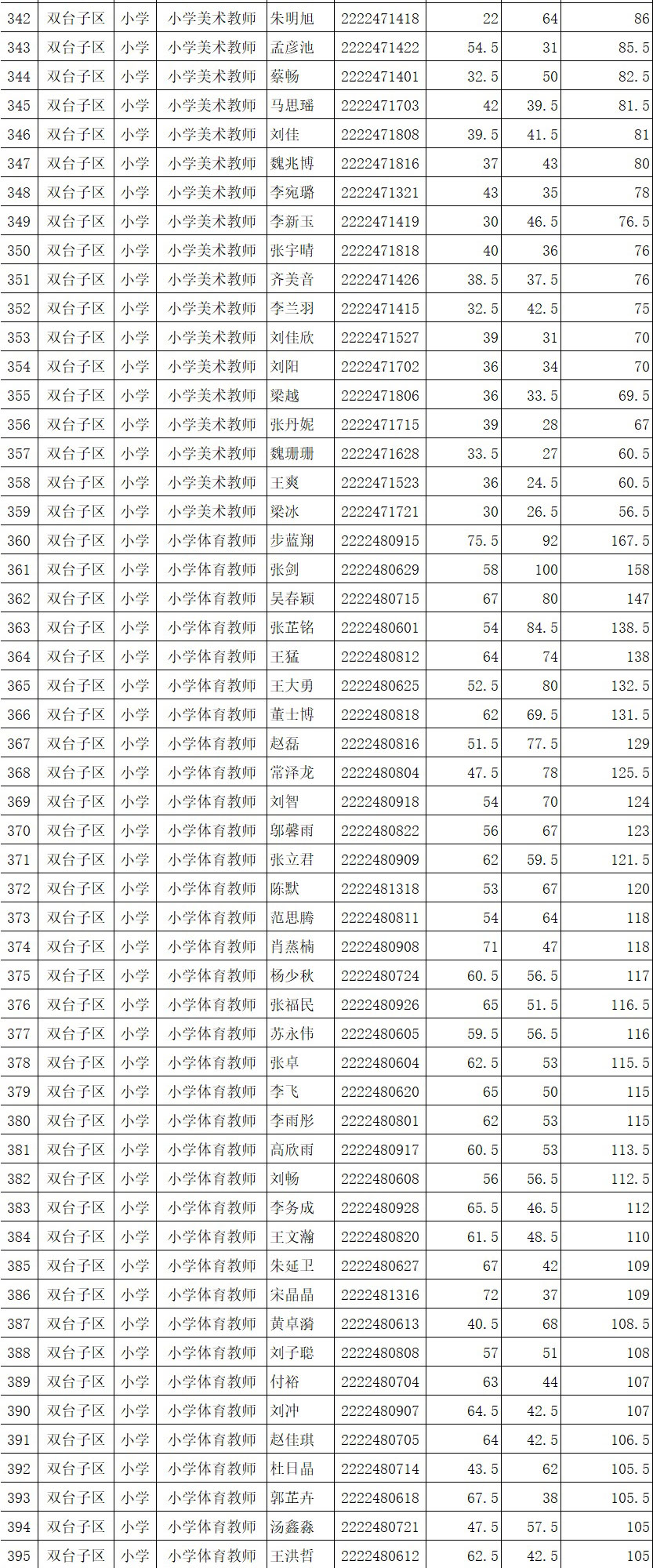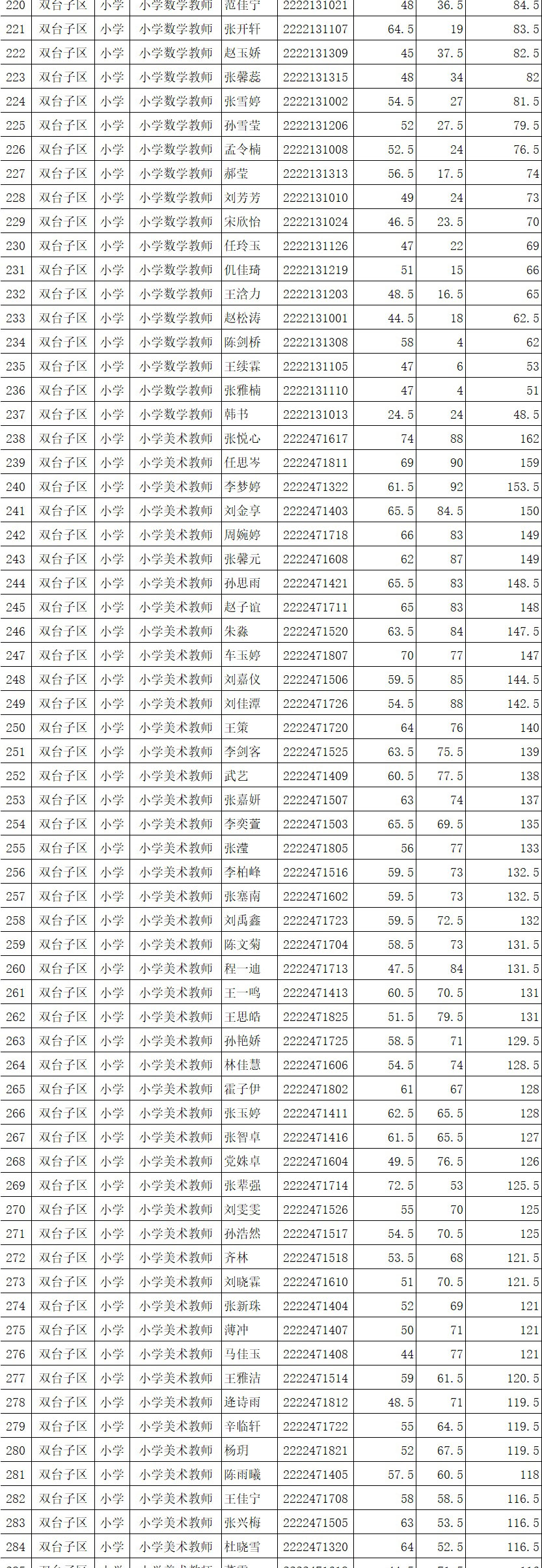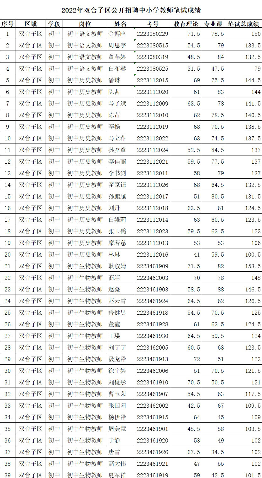 现将2022年双台子区公开招聘中小学教师笔试成绩公告如下(缺考人员未予公布),对成绩有异议的考生,请本人于2022年7月19日上午11:00至12:00前拨打电话:0427—2360427 进行登记查分,需提供准考证号、身份证号,分数查询结果将于2022年7月19日下午16:00前通过报名电子邮箱通知本人。