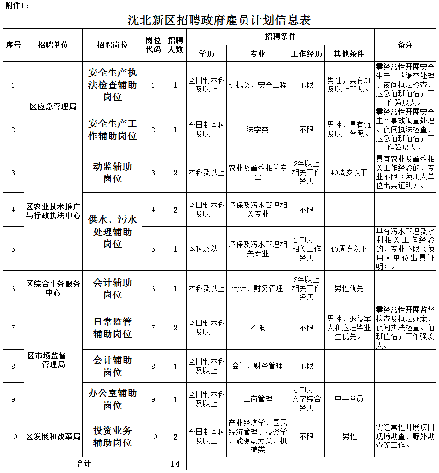 本次招聘政府雇员14名,其中:区应急管理局2名、区农业技术推广与行政执法中心5名、区综合事务服务中心1名、区市场监督管理局4名、区发展和改革局2名。具体情况详见附件1(见文中最下方)。