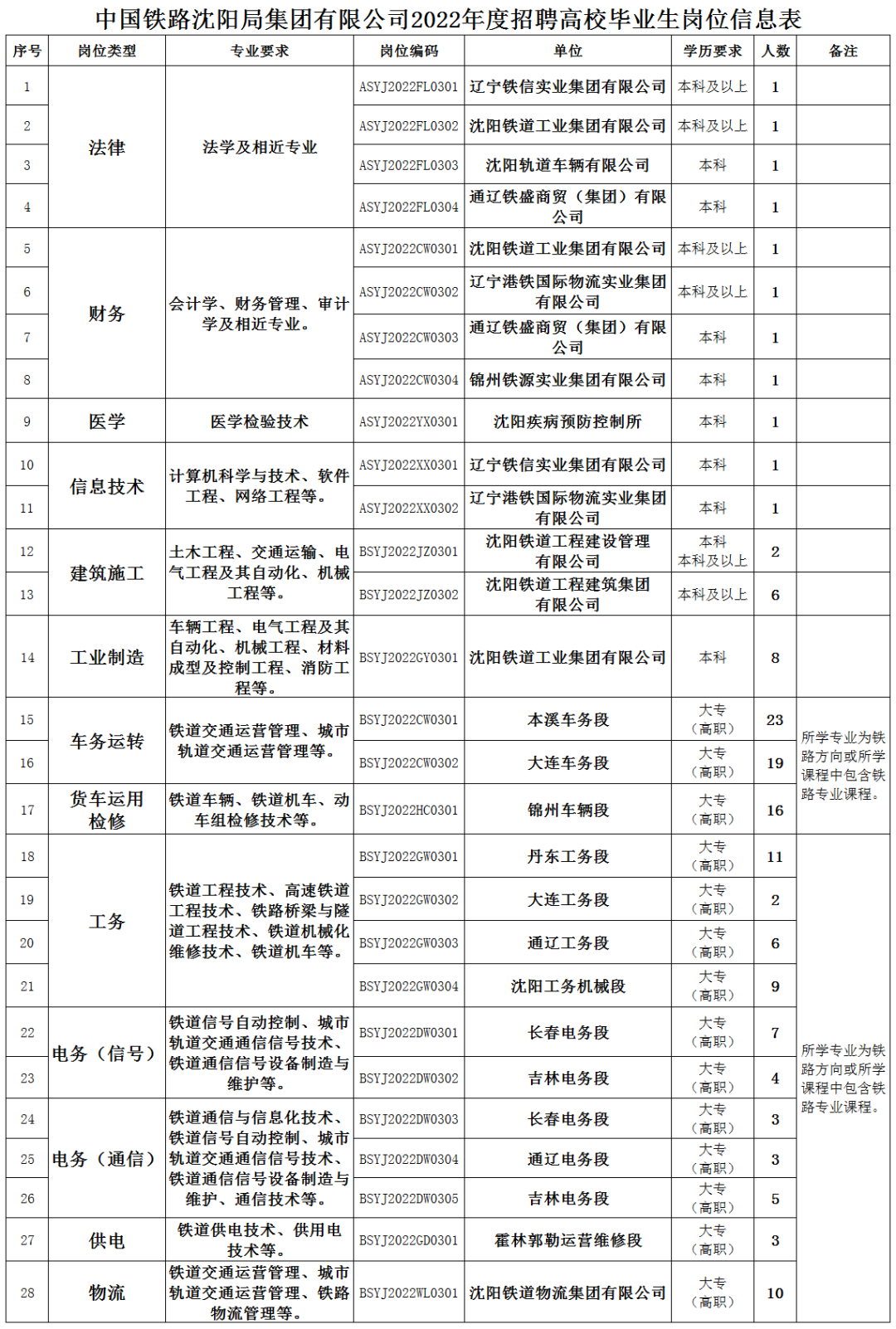 中国铁路沈阳局集团有限公司根据企业发展需要,拟招聘普通高等院校大专(高职)及以上学历毕业生,现将有关事项公告如下: