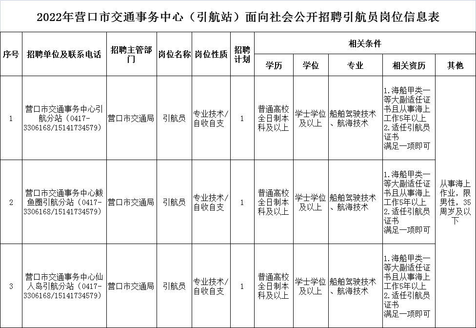 本次面向社会公开招聘3名引航员,符合报考基本条件和招聘岗位要求的人员均可报考。具体招聘岗位信息详见《营口市2022年营口市交通事务中心(营口港引航站)面向社会公开招聘引航员岗位信息表》。