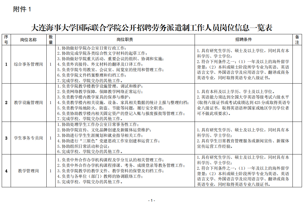 1.大连海事大学国际联合学院公开招聘劳务派遣制工作人员岗位信息一览表