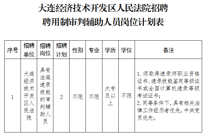 本次招聘岗位为大连经济技术开发区人民法院具有法庭速录技能的聘任制审判辅助人员岗位,共招聘2名,具体岗位报名条件见附件《大连经济技术开发区人民法院招聘聘用制审判辅助人员岗位计划表》。