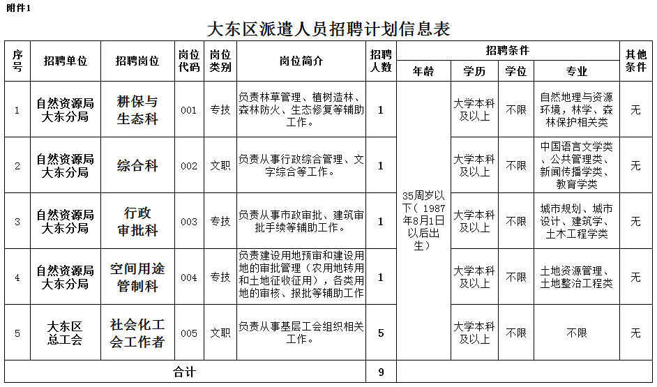 具体岗位数量、职责及条件见《大东区派遣人员招聘计划信息表》(附件1)(见文中最下方)。