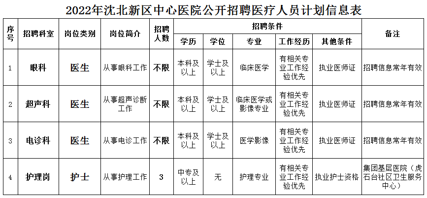 2022年沈北新区中心医院公开招聘医疗人员计划信息表.doc