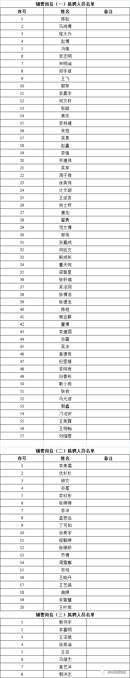 鞍山市公安局(立山公安分局)2022年招聘警务辅助人员工作已经结束,根据《鞍山市公安(立山公安分局)2022年招聘警务辅助人员公告》的相关规定,即日起对体检、考察、培训合格的拟 聘用人员(名单详见附件)予以公示,公示时间为5个工作日。