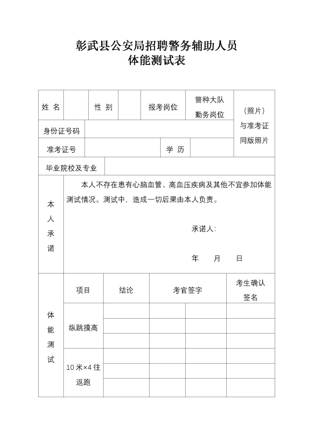 所有考生:自行下载打印并按要求如实填写《彰武县公安局招聘警务辅助人员体能测试表》,于测试当天提交给现场工作人员。