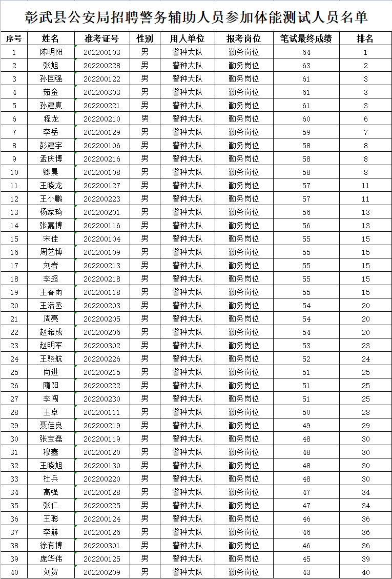 根据《彰武县公安局招聘警务辅助人员公告》,笔试成绩达到最低合格分数线(含)以上的考生,按照招聘计划1:2的比例确定参加体能测试人选,未入围体能测试但成绩与入围最低成绩接近的考生,请保持电话畅通,如出现递补情形按要求参加体能测试。参加体能测试人员详见(附件1)。现将相关事宜通知如下(请所有考生认真阅读):