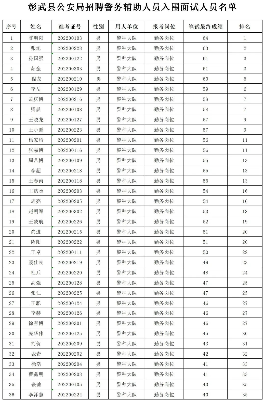 根据《彰武县公安局招聘警务辅助人员公告》,招聘警务辅助人员工作经过报名、资格审查、笔试、体能测试,即将进入面试环节,进入面试的考生名单详见《附件》。现将面试相关事宜通知如下: