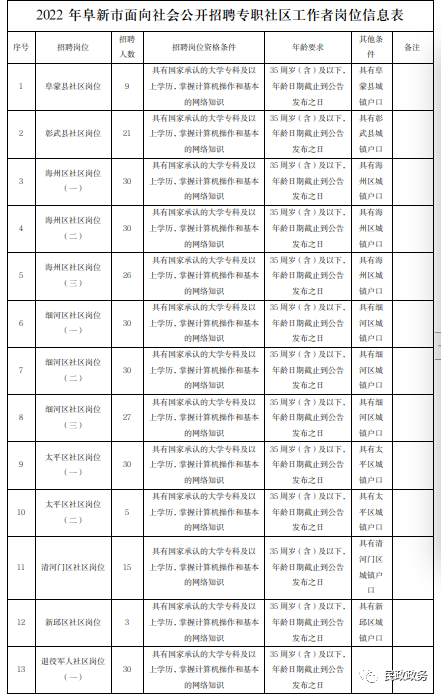 1.应聘人员须具有阜新市城镇户口,且只能报考户籍所在县区社区工作岗位。户籍时间截止到公告发布之日前一天。