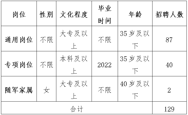 一、招聘岗位及人数本次共招聘专职社区工作者129人,其中通用岗位87人,专项岗位40人,随军家属岗位2人,具体岗位见附表。