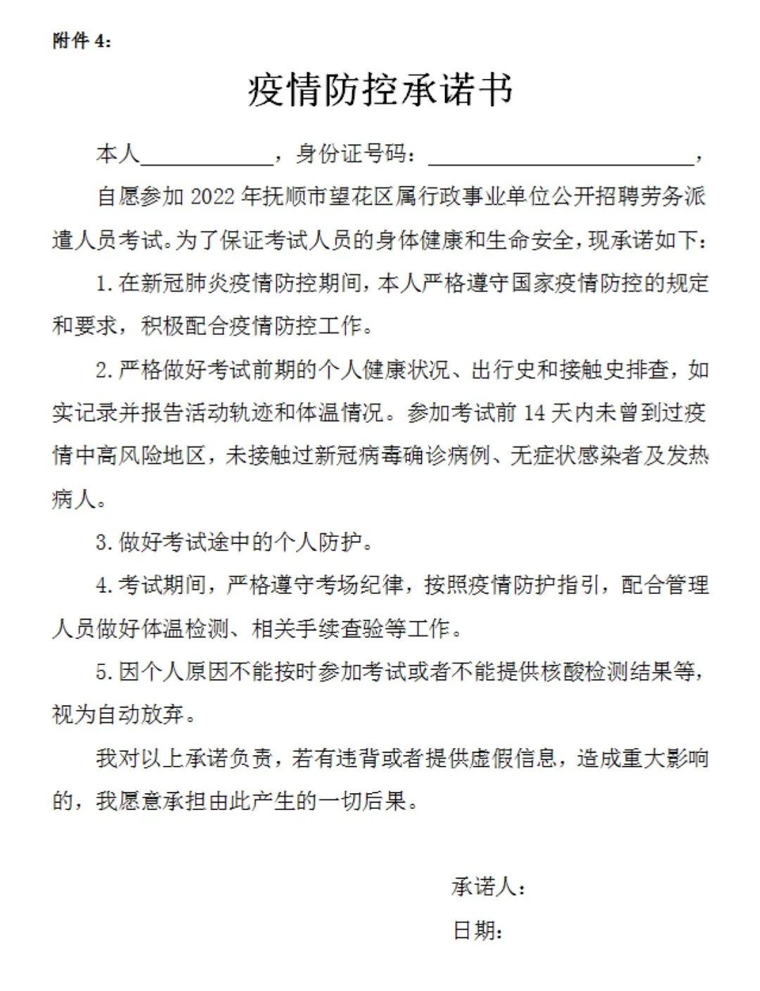 6、报名实行诚信承诺制度,考生根据《2022年抚顺市望花区人力资源和社会保障局关于区属行政事业单位公开招聘劳务派遣人员的公告》认真填写报名登记表,并保证所填信息真实有效。主考单位根据报名信息和招聘条件结合考生提供的相关材料进行资格初审及复核,资格审查工作贯穿招聘全过程,一经发现报考者与招聘岗位所要求的资格条件不符或提供虚假材料的,将取消其考试、聘用资格。