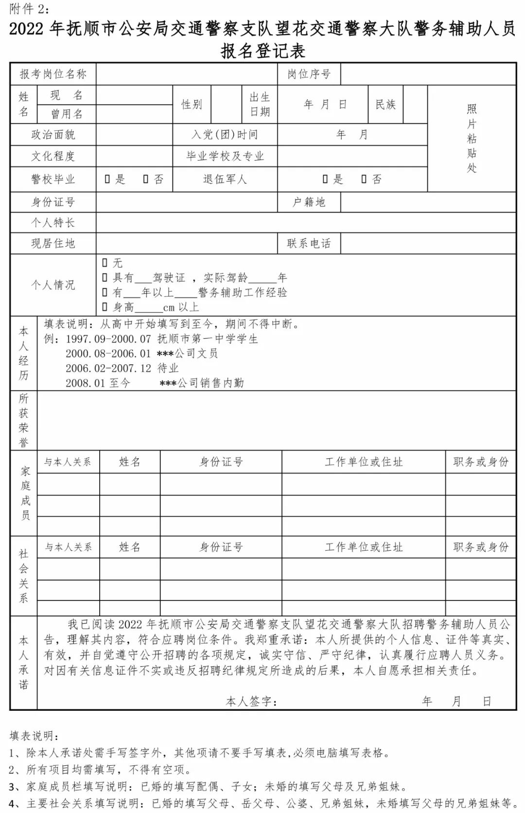 (1)自行下载打印并填写《2022年抚顺市公安局交通警察支队望花交通警察大队警务辅助人员报名登记表》(附件2)并粘贴近期1寸彩色照片(免冠蓝色背景),一式两份;