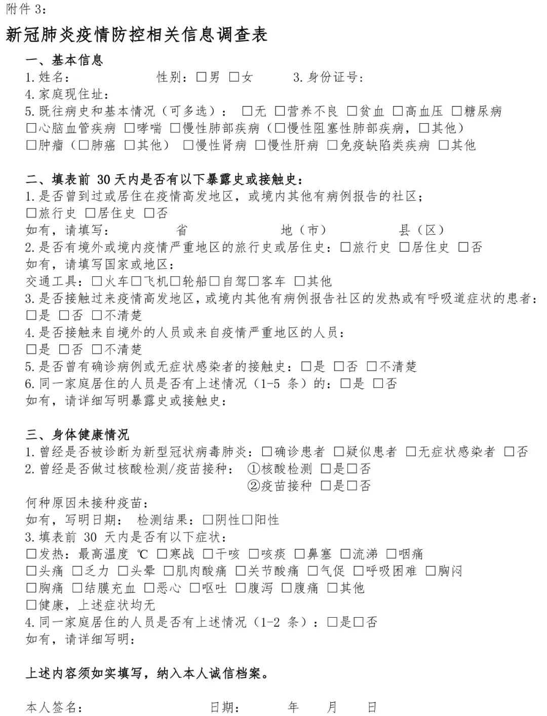 (4)自行下载打印并填写《新冠肺炎疫情防控相关信息调查表》(附件3);