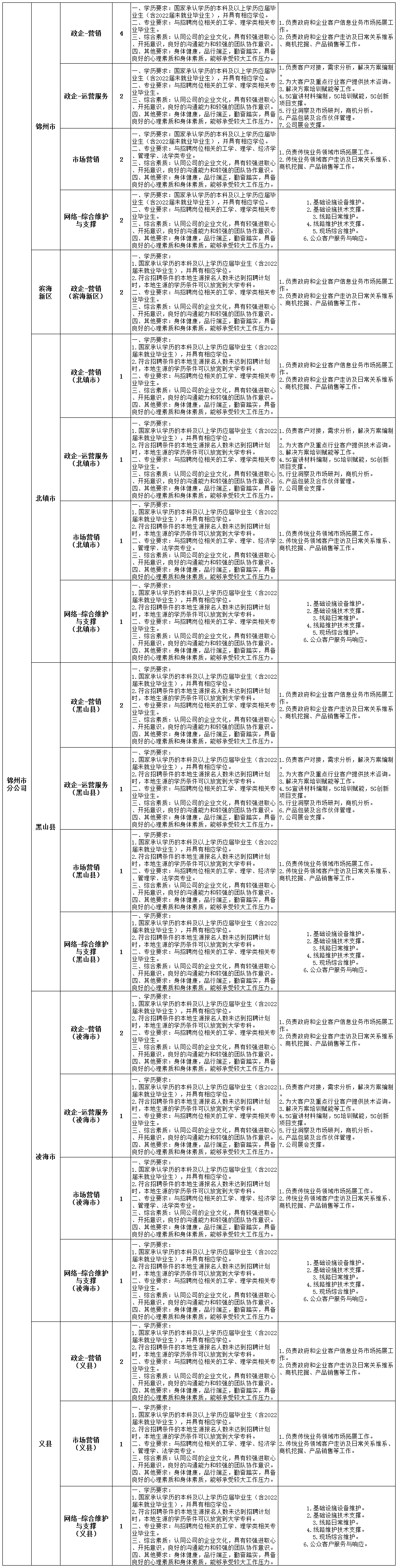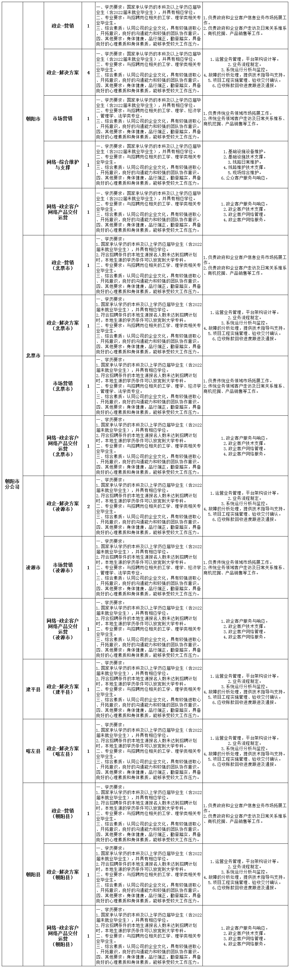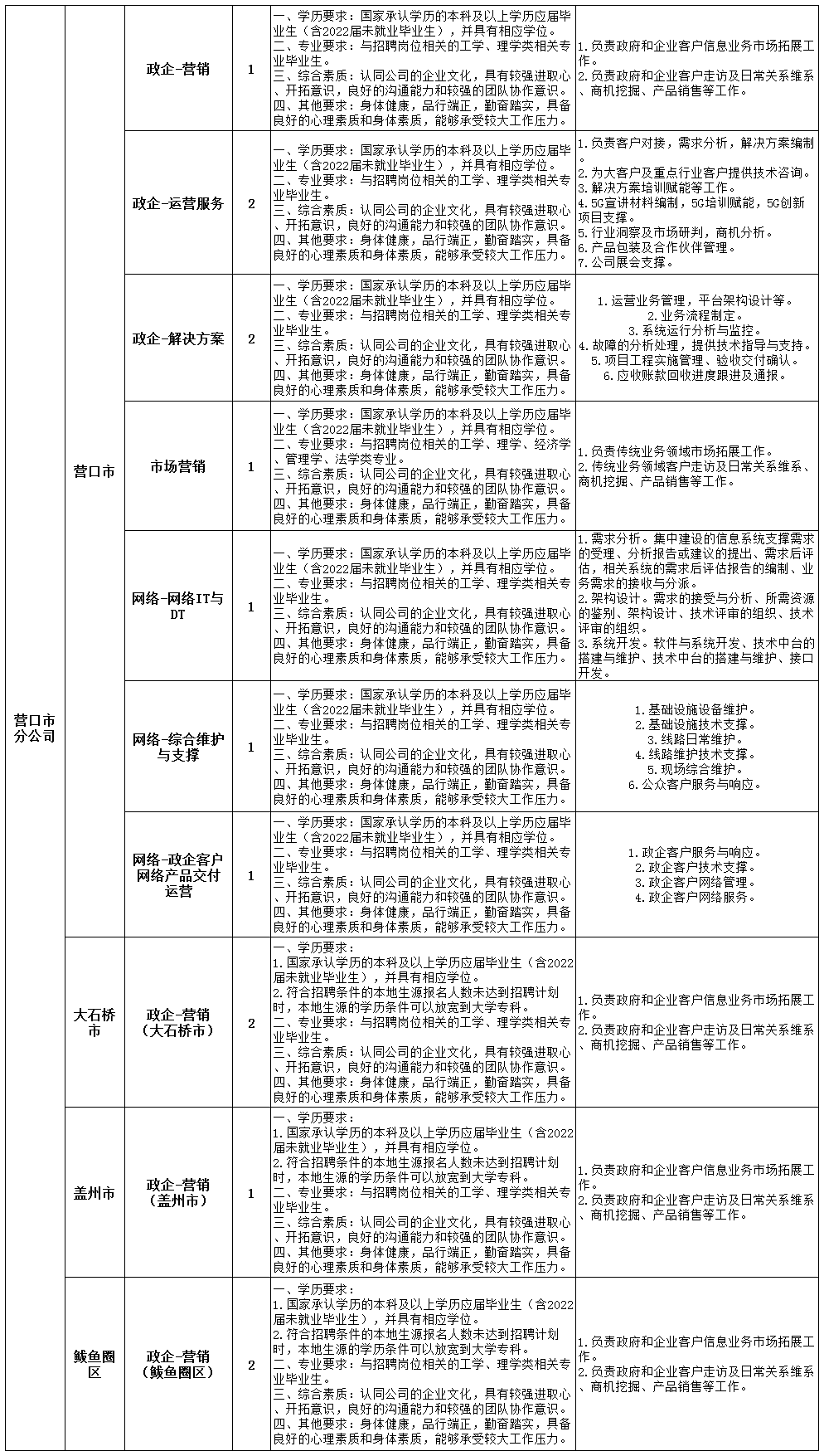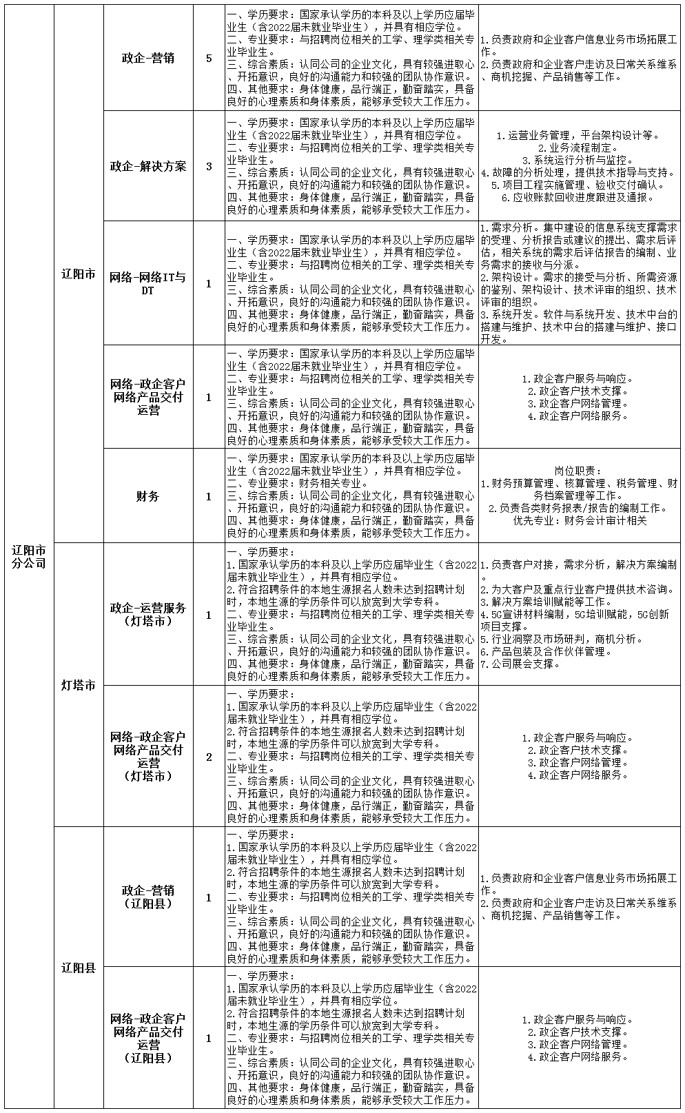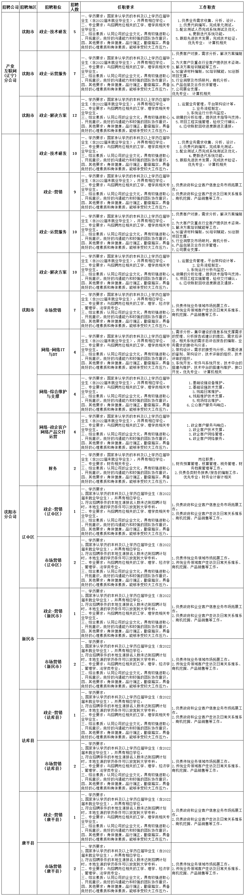中国联通辽宁省分公司招聘职位如下:(辽宁省14个城市及下属地区)