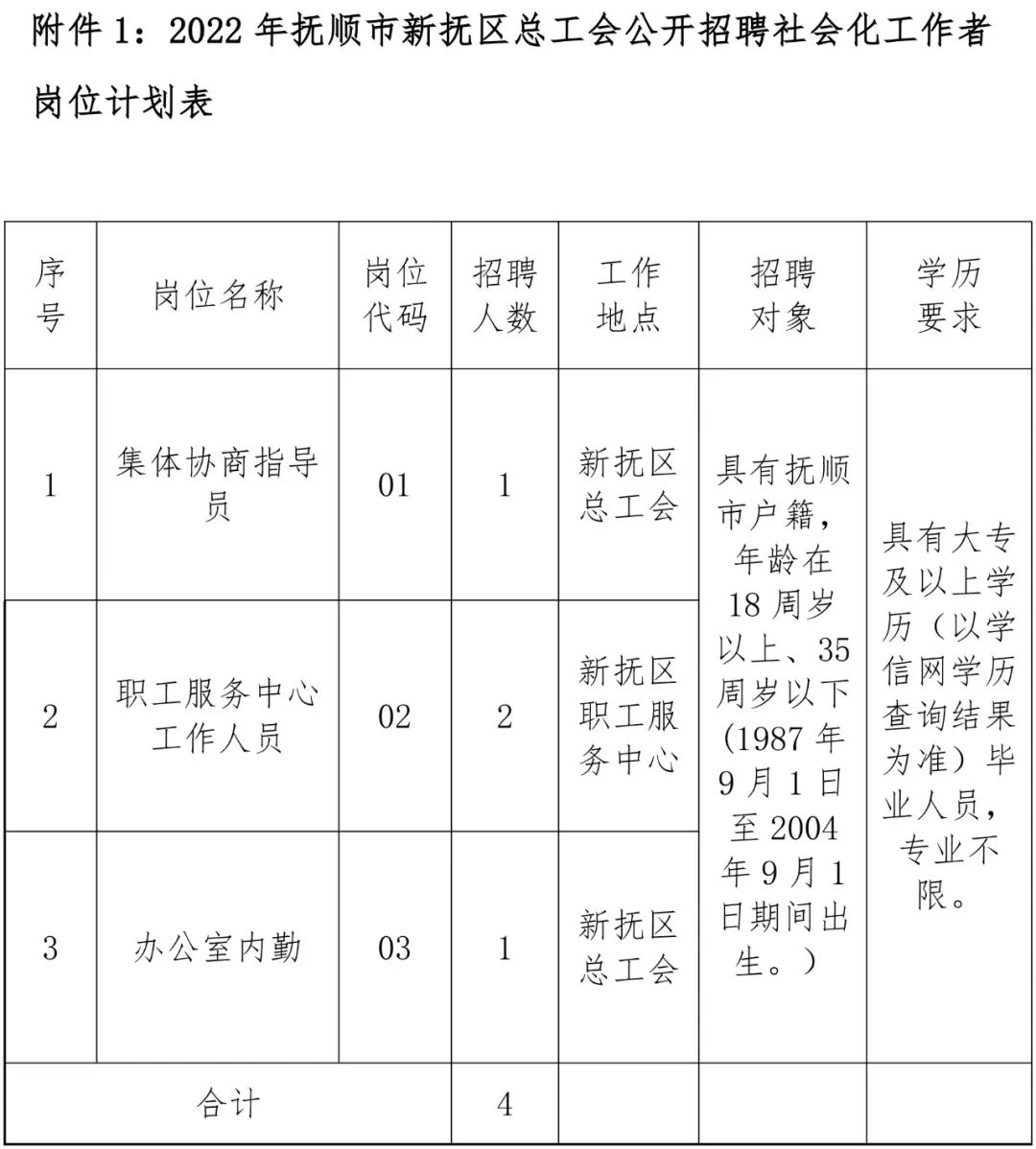 为认真贯彻落实工会改革部署要求,更好地适应新时代工会工作需要,充实工会工作力量,夯实工会工作基础,经新抚区总工会党组决定、区人民政府批准,现面向社会公开招聘新抚区总工会社会化工作者4人,主要负责工会精准普惠服务、工资集体协商指导、办公室内勤等工作,现将有关事项公告如下: