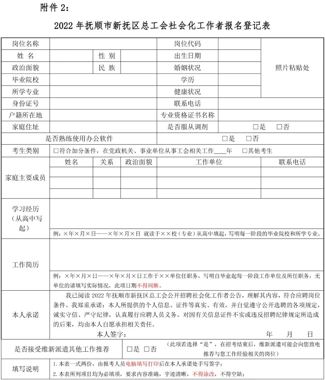 (1)《2022年抚顺市新抚区总工会社会化工作者报名登记表》(附件2)一式两份(报名者自行下载报名登记表,填好打印后粘贴近期一寸正面免冠彩色照片)。